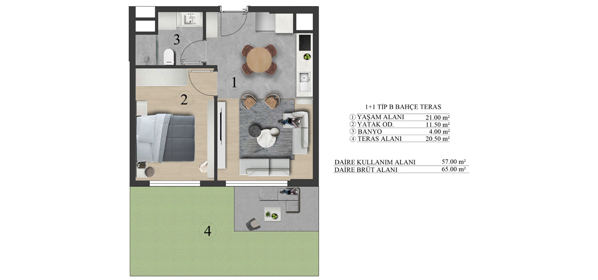 1+1 Bahçe Teras (Tip B) daireler, doğayla iç içe yaşamak isteyenler için özenle tasarlandı. Özel kullanım alanına sahip bahçe terası, sabah kahvaltılarından akşamüstü kahve keyfine kadar açık havada geçirilen her anı ayrıcalıklı kılar. İç mekandaki şık ve modern çizgiler, dış mekandaki yeşil dokuyla birleşerek sıcak ve huzurlu bir atmosfer yaratır. Tek kişilik ya da çift kişilik kullanım için ideal olan bu daireler, şehirde doğayla buluşmak isteyenler için eşsiz bir yaşam alanı sunar. Günün yorgunluğunu doğanın huzuruyla atmak isteyenler için birebir.